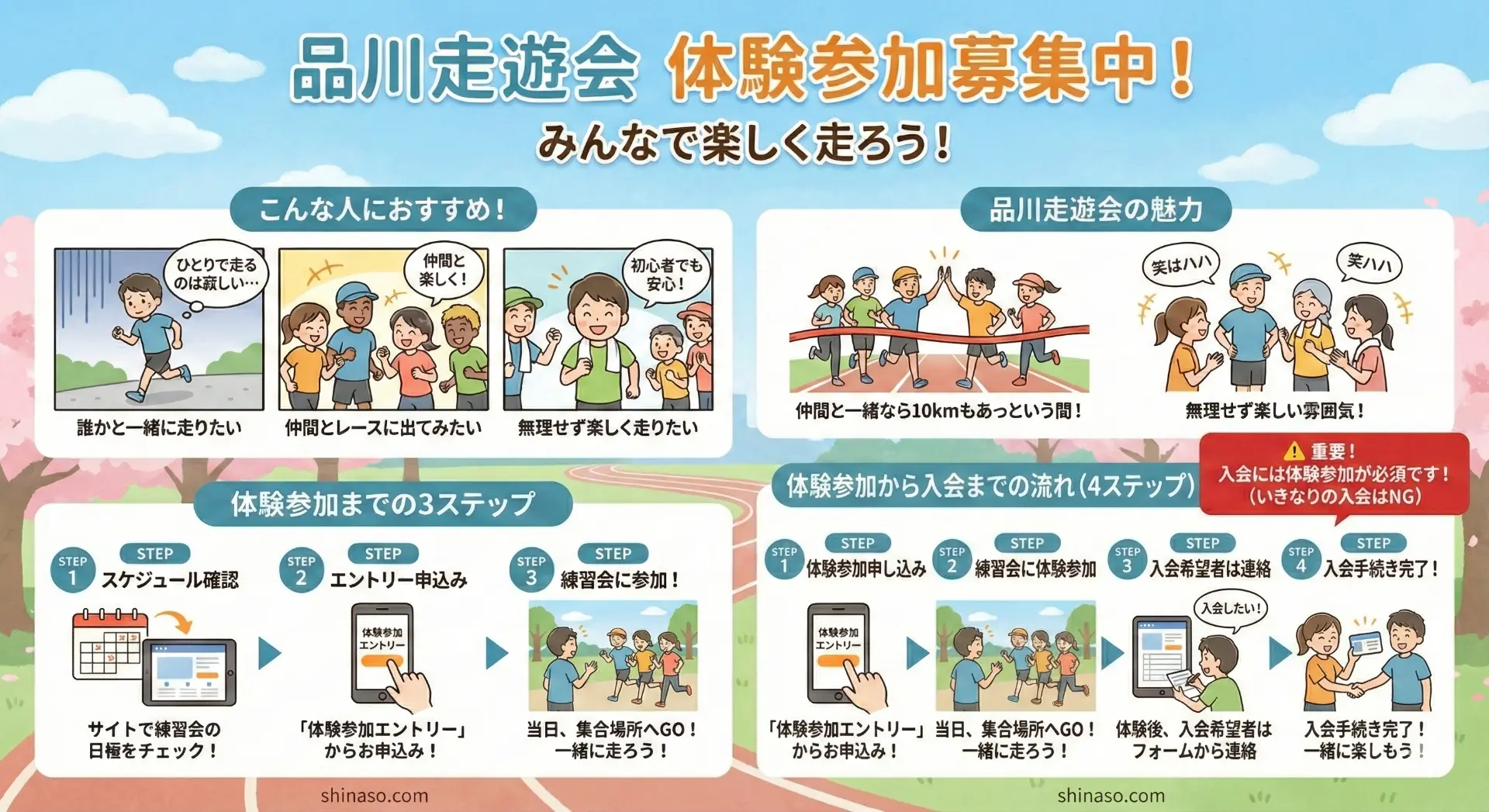 品川走遊会の「特徴」や「Q&A」、「 体験参加から入会までの流れ」などは、各ページをご覧ください。(※オレンジ色のリンク文字をクリックすると該当ページが開きます)