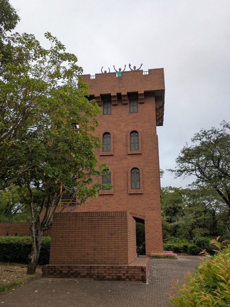 六道山公園の展望台の前で。元気のある人は5階分の展望台の上まで上がってきました。