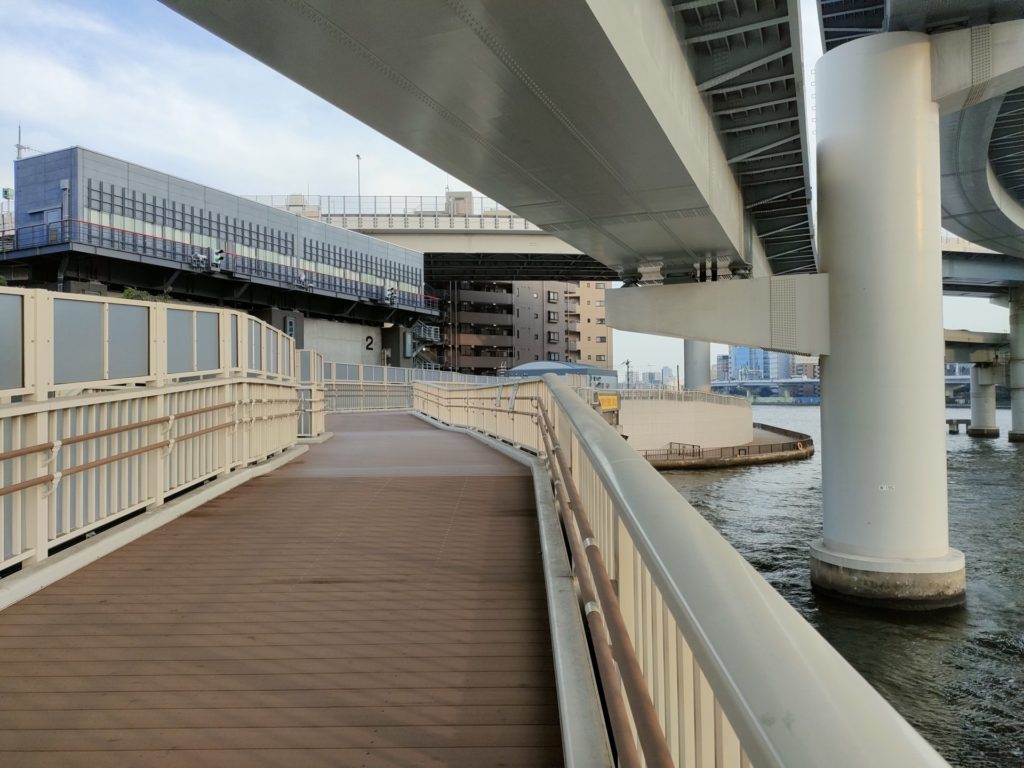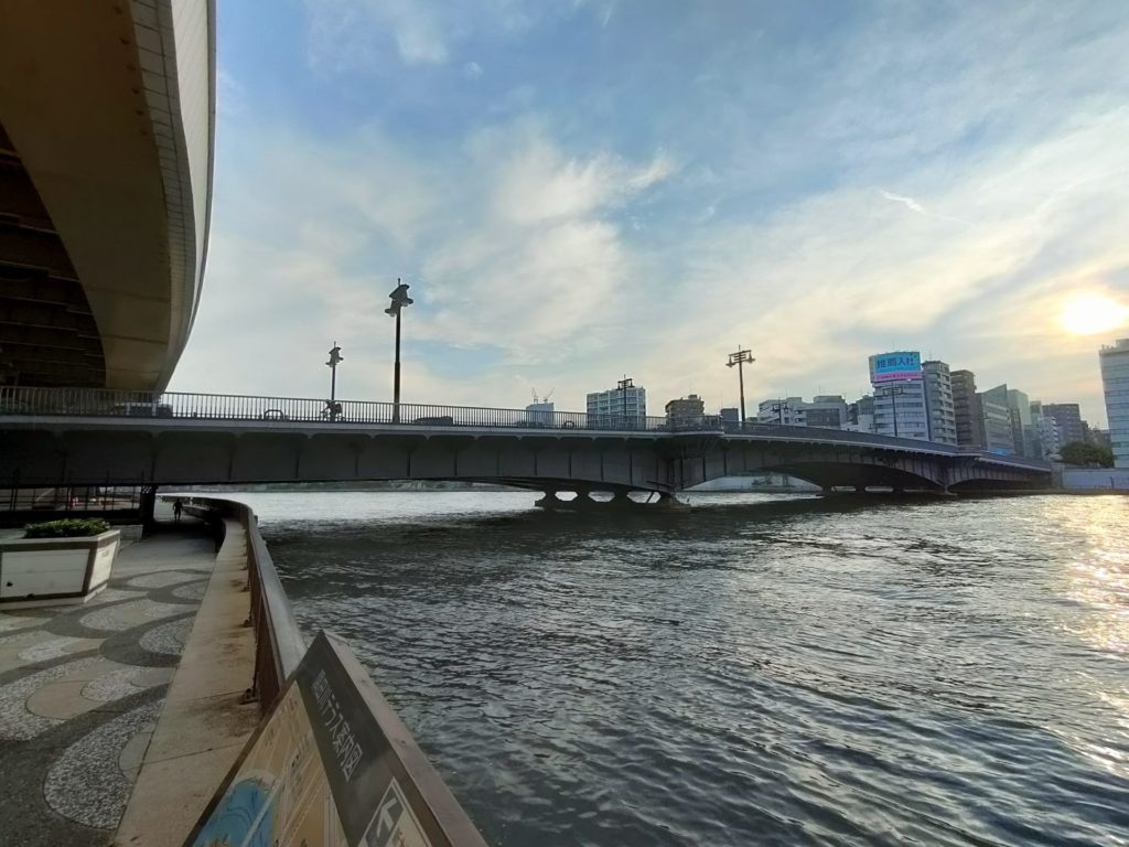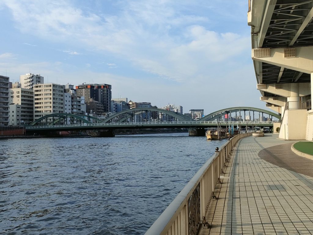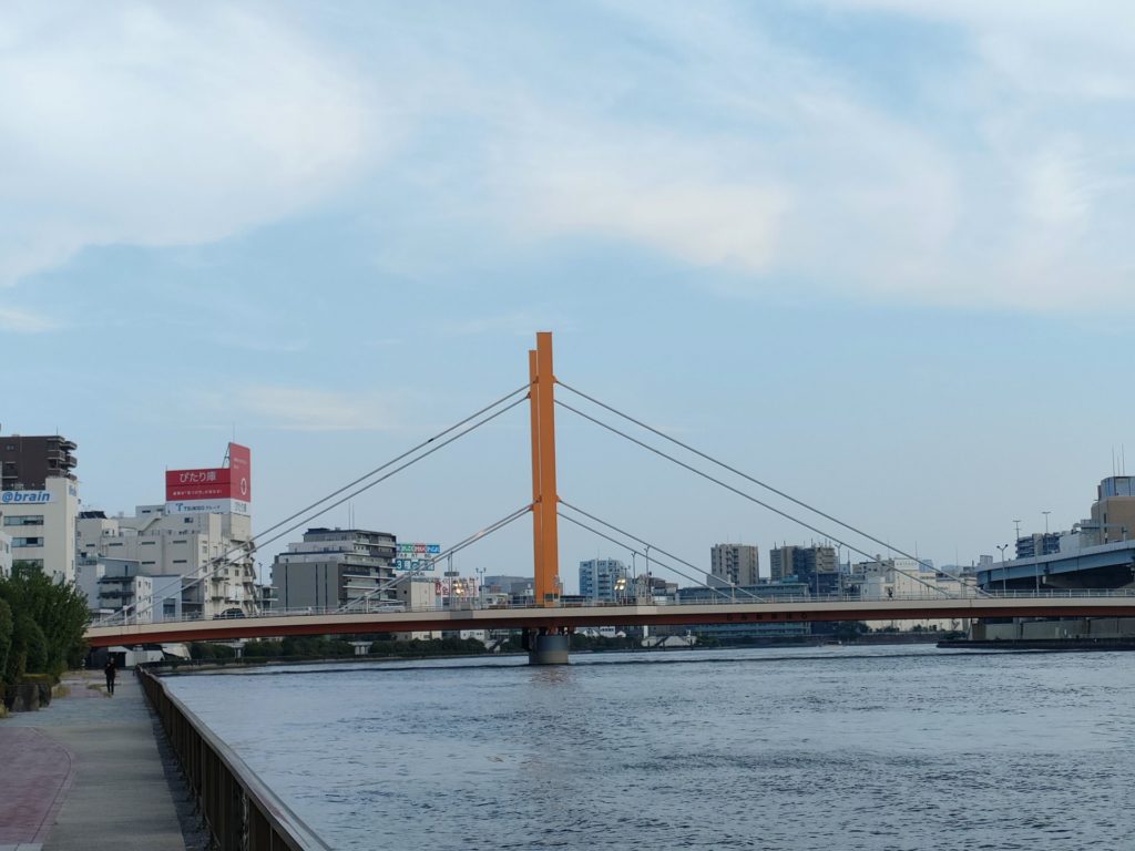 隅田川テラスは日中の練習会、イブニングランと何度も走っていますが、今までは橋の下を通り抜ける事が多かったので、今回は隅田川や水門に架かる橋を全て渡ってみたところ大正解、橋を渡るとき風が通り抜け、少し暑さが凌げました。