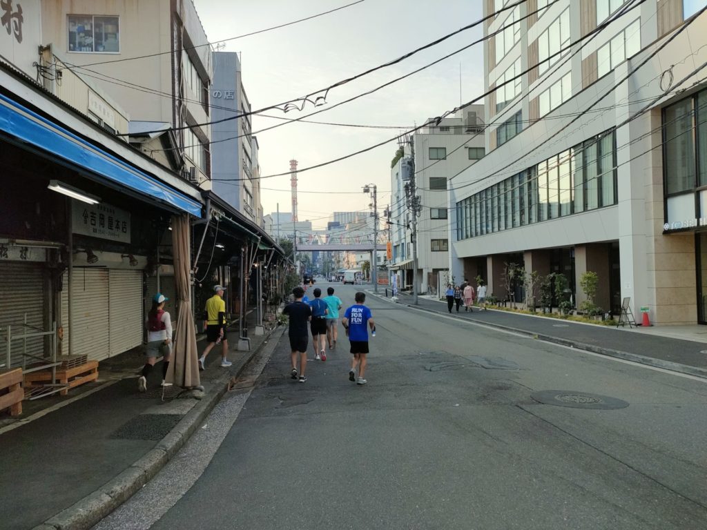 日中は食べ歩きを楽しむ観光客で賑わう築地場外市場の波除通りも夕方は走り放題!