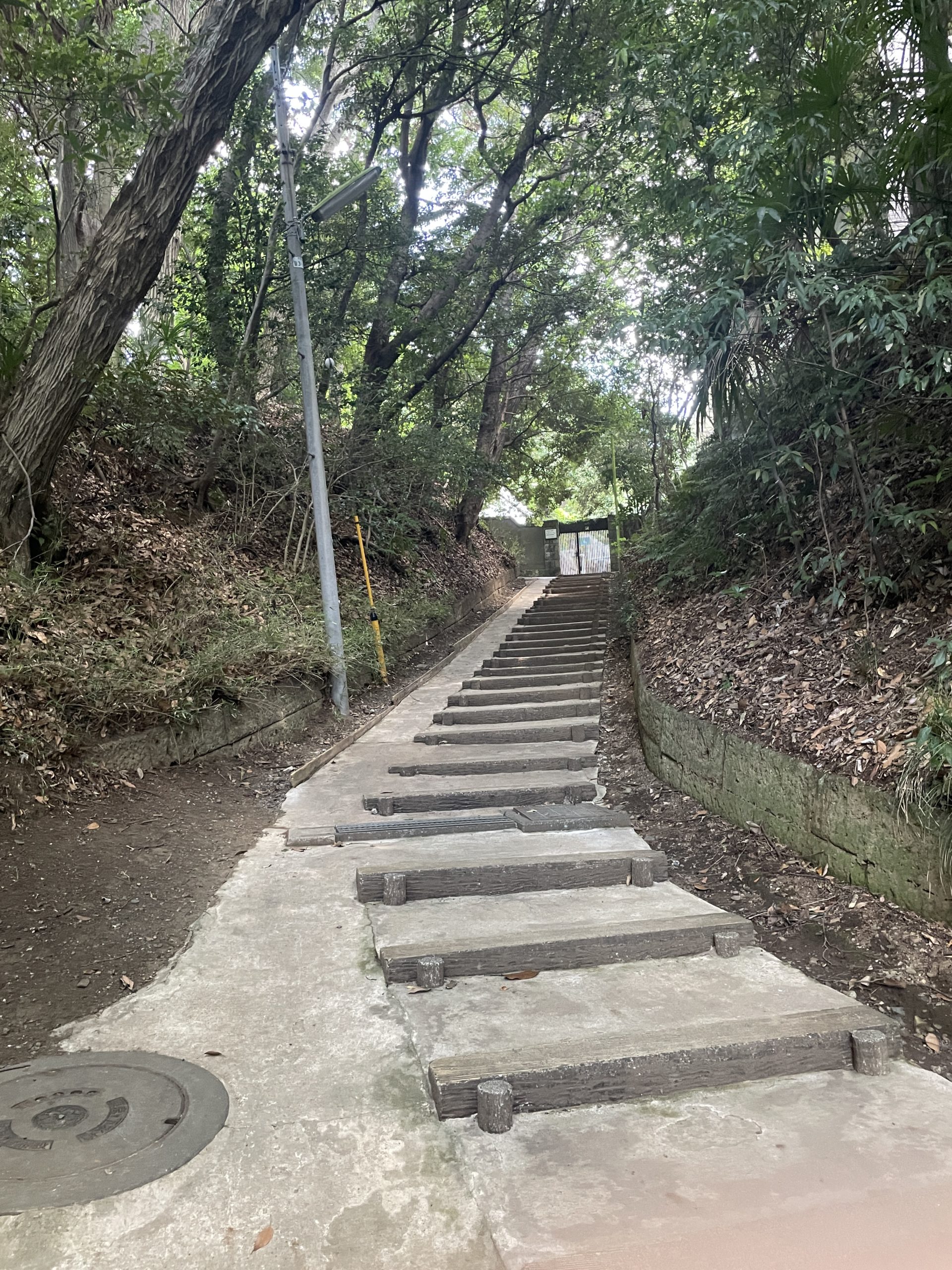 かなりの傾斜で車は下りの一方通行のみ。歩道は途中から階段です。