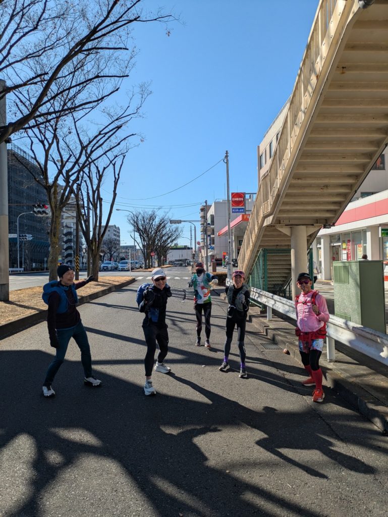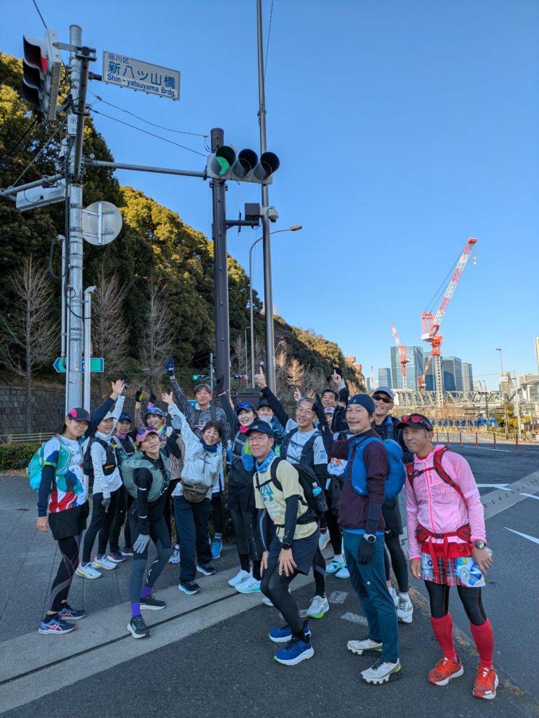 まずは分科会に参加された皆さんは、京急鶴見市場駅に集合し、駅から徒歩2分程の10区の鶴見中継所に向かいました。ここは前日学生たちが箱根駅伝最後の襷を繋いだ中継所で参加者もその光景をイメージしてポーズ。ここからゴールまでは23㎞の道のりです。区間賞をとった駒澤大学の佐藤圭汰選手は1時間7分31秒でゴールまで走りました。私たちはというと、多くの信号に行く先を阻まれながら鶴見中継所から練習会の集合場所である京急新馬場駅までの約12㎞を1時間40分ほどかけて走りました。信号を言い訳にはできませんね(笑)