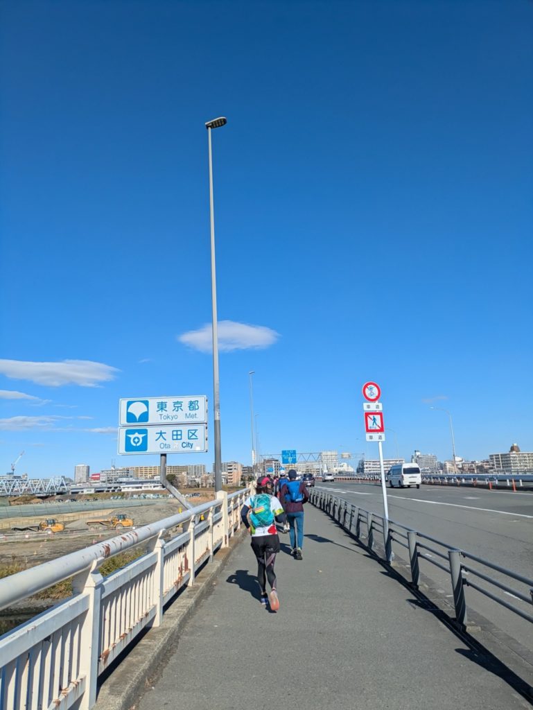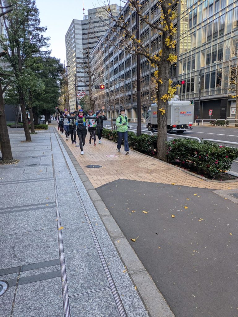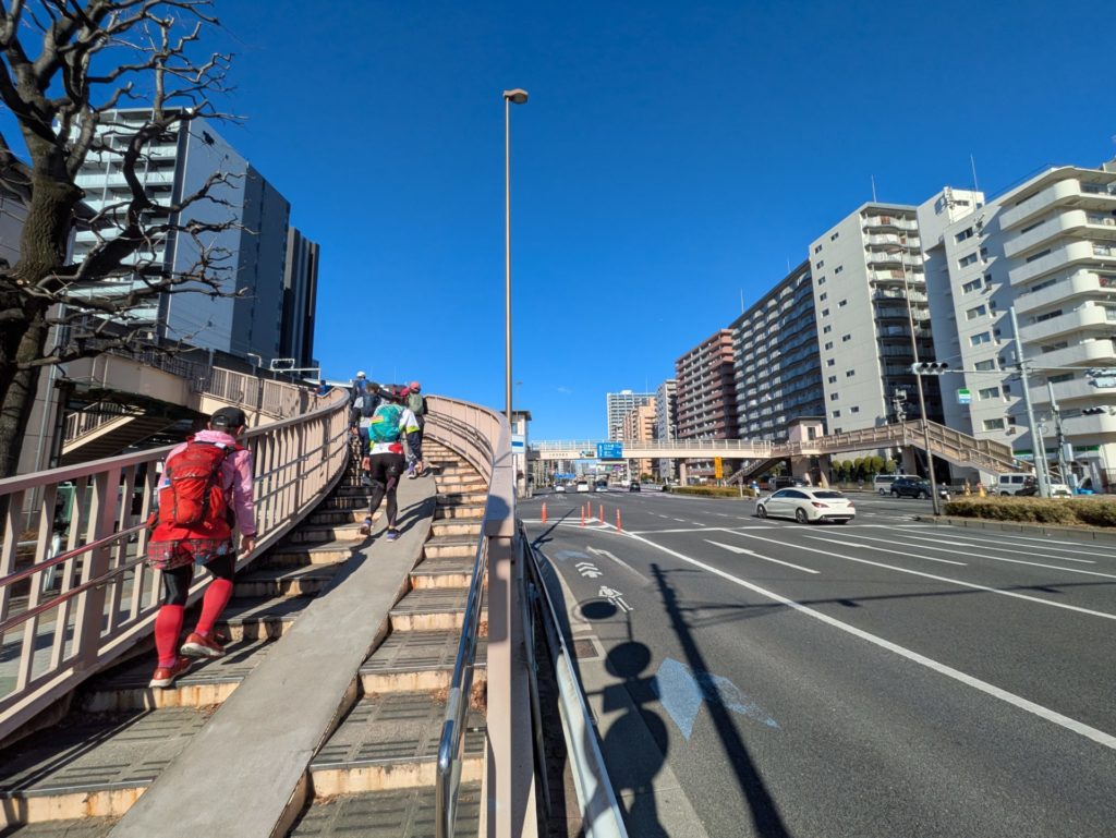橋を渡ったところで一人合流し、7人で品川に向かいました。選手たちは道路を真っすぐ品川、日本橋に向かいましたが、私たちは歩道橋を越えながらのランでした。
