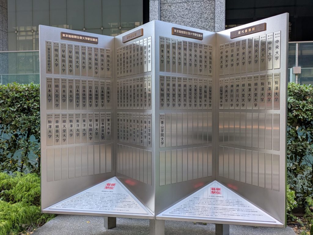 ゴール地点には、歴代の優勝校のプレートと銅像が立っています。今年のプレートは昨日の今日でまだ入っていませんでした。